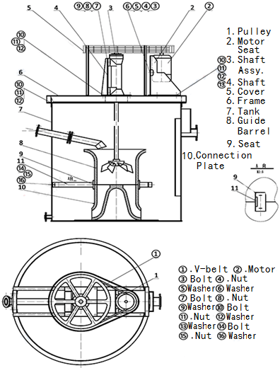 The high efficiency agitation tank is a kind of agitator which can make the pulp circulate up and down inside the agitator tank. The motor drives the impeller to rotate through the pulley, and then mixes the slurry and the reagent.