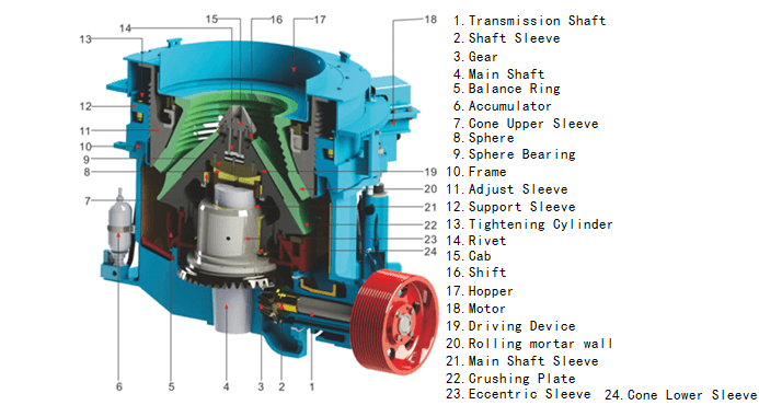 When the airplane is running, the eccentric sleeve assembly drives the spindle assembly to rotate with the big gear. When the material is added to the crushing chamber, the spindle assembly rotates slowly in the eccentric copper sleeve under the resistance of the material. The trajectory of the inner cone seems to oscillate back and forth in the crushing chamber, while slowly rotating.