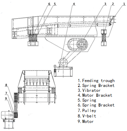 The feeder is mainly composed of vibration frame, spring, vibrator, motor vibration frame and motor. The exciter is composed of eccentric shaft and gear in a specific position. When assembling, the two gears must be meshed according to the mark, and driven by motor to rotate the two eccentric axes, thus generating a huge composite linear exciting force, which makes the body vibrate forcibly on the supporting spring. The material is driven by this vibration to slides and throws on the trough, so that the material moves forward. To achieve the purpose of feeding. When the material passes through the sieve bar on the trough body, the smaller material can fall through the clearance of the sieve bar, and the sieving effect can be achieved without going through the next crushing process.